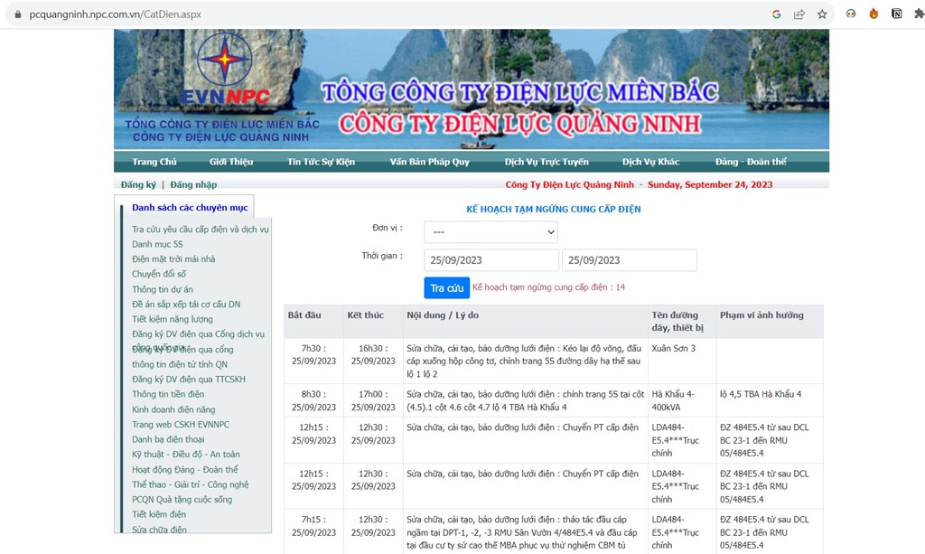 Công ty Điện lực Quảng Ninh thông báo về kế hoạch lịch cắt điện trên toàn địa bàn tỉnh trong ngày 25/9.