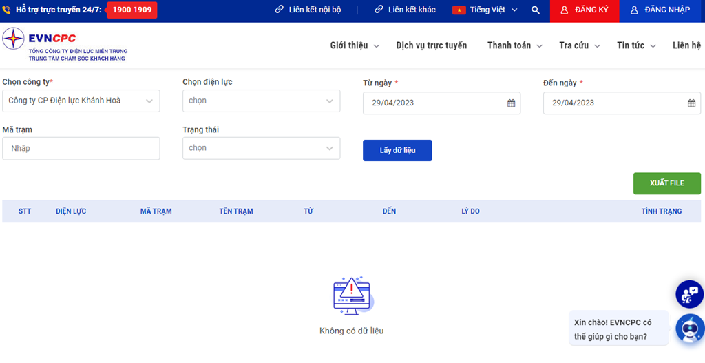Lịch cắt điện Khánh Hòa ngày 29/4 cập nhật tại website của EVNCPC. Ảnh: BNEWS