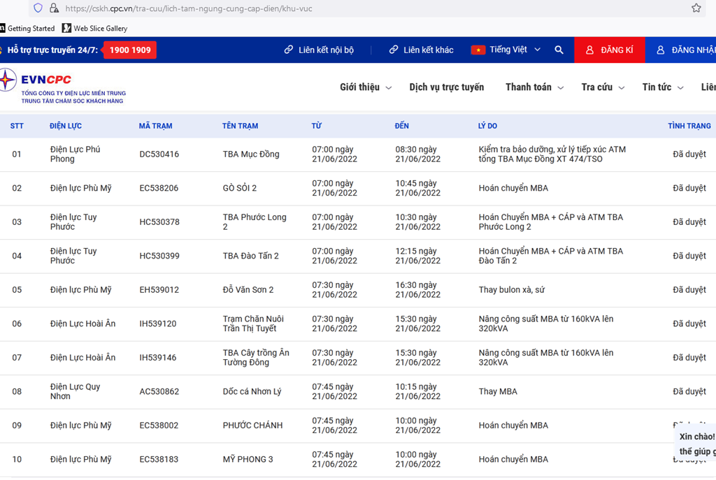| 10 | Điện lực Phù Mỹ | EC538183 | MỸ PHONG 3 | 07:45 21/06/2022 | 10:00 21/06/2022 | Hoán chuyển MBA |
