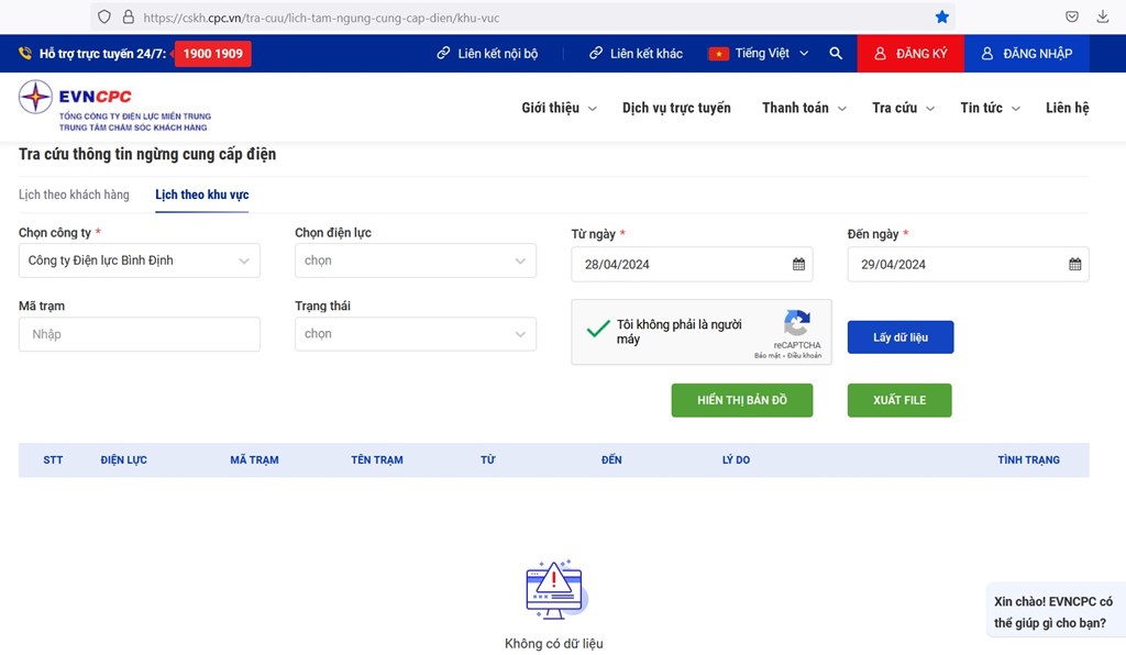 Lịch cắt điện Bình Định ngày mai 28/4 cập nhật ngày 27/4 tại website của EVNCPC. Ảnh: BNEWS