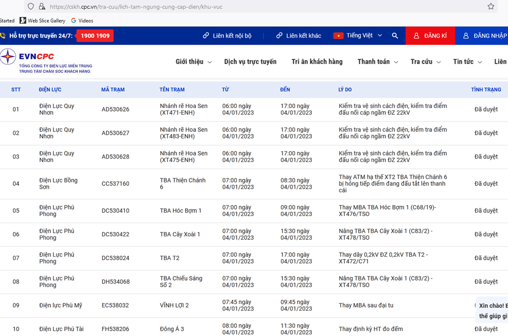 | 9 | Điện lực Phù Mỹ | EC538032 | VĨNH LỢI 2 | 07:45 04/01/2023 | 09:45 04/01/2023 | Thay MBA sau đại tu | Đã duyệt |