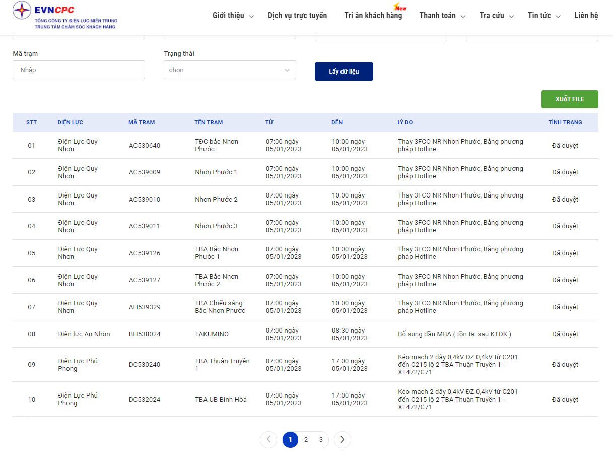 | Điện Lực Quy Nhơn | AH539329 | TBA Chiếu sáng Bắc Nhơn Phước | 07:00 05/01/2023 | 10:00 05/01/2023 | Thay 3FCO NR Nhơn Phước, Bằng phương pháp Hotline | Đã duyệt |