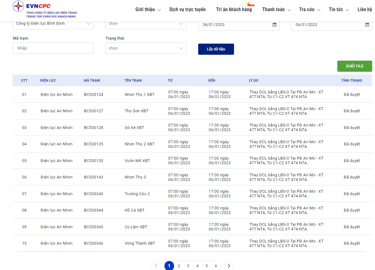 | Điện lực An Nhơn | BC530345 | Cù Lâm XBT | 07:00 06/01/2023 | 17:00 06/01/2023 | Thay DCL bằng LBS-O Tại PĐ An Mơ - XT 477 NTA, Từ C1-C2 XT 474 NTA. | Đã duyệt |