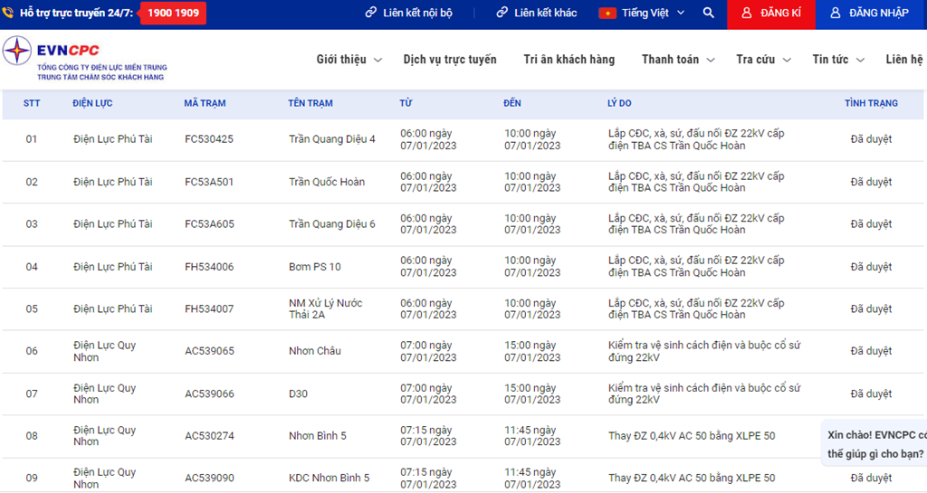 | 1 | Điện Lực Phú Tài | FC530425 | Trần Quang Diệu 4 | 06:00 07/01/2023 | 10:00 07/01/2023 | Lắp CĐC, xà, sứ, đấu nối ĐZ 22kV cấp điện TBA CS Trần Quốc Hoàn | Đã duyệt |