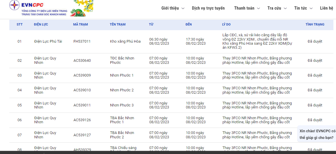 | Điện Lực Quy Nhơn | AC530640 | TĐC Bắc Nhơn Phước | 07:00 08/02/2023 | 10:00 08/02/2023 | Thay 3FCO NR Nhơn Phước, Bằng phương pháp Hotline, lắp yếm chống gãy đầu cốt | Đã duyệt |