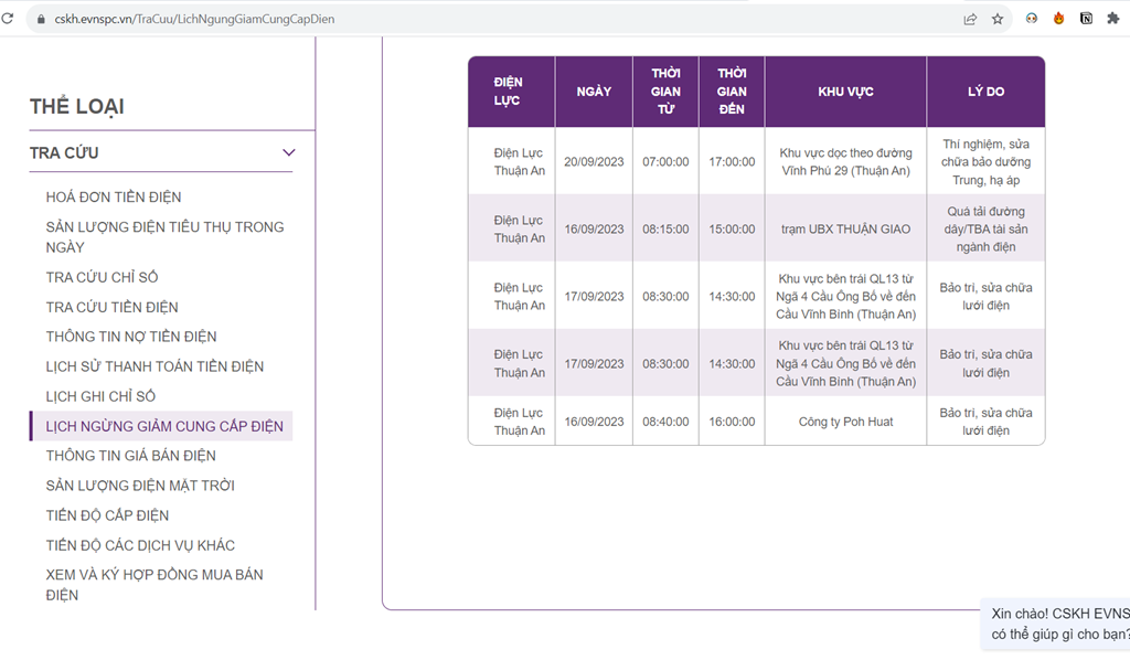 | Điện Lực Thuận An | 17/09/2023 | 08:30:00 | 14:30:00 | Khu vực bên trái QL13 từ Ngã 4 Cầu Ông Bố về đến Cầu Vĩnh Bình (Thuận An) | Bảo trì, sửa chữa lưới điện |