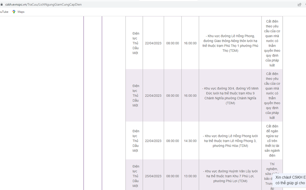 | Điện lực Thủ Dầu Một | 22/04/2023 | 08:00:00 | 16:00:00 | - Khu vực đường Lê Hồng Phong, đường Giao thông-Nông thôn lưới hạ thế thuộc trạm Phú Thọ 1 phường Phú Thọ (TDM) | Cắt điện theo yêu cầu của cơ quan nhà nước có thẩm quyền theo quy định của pháp luật |