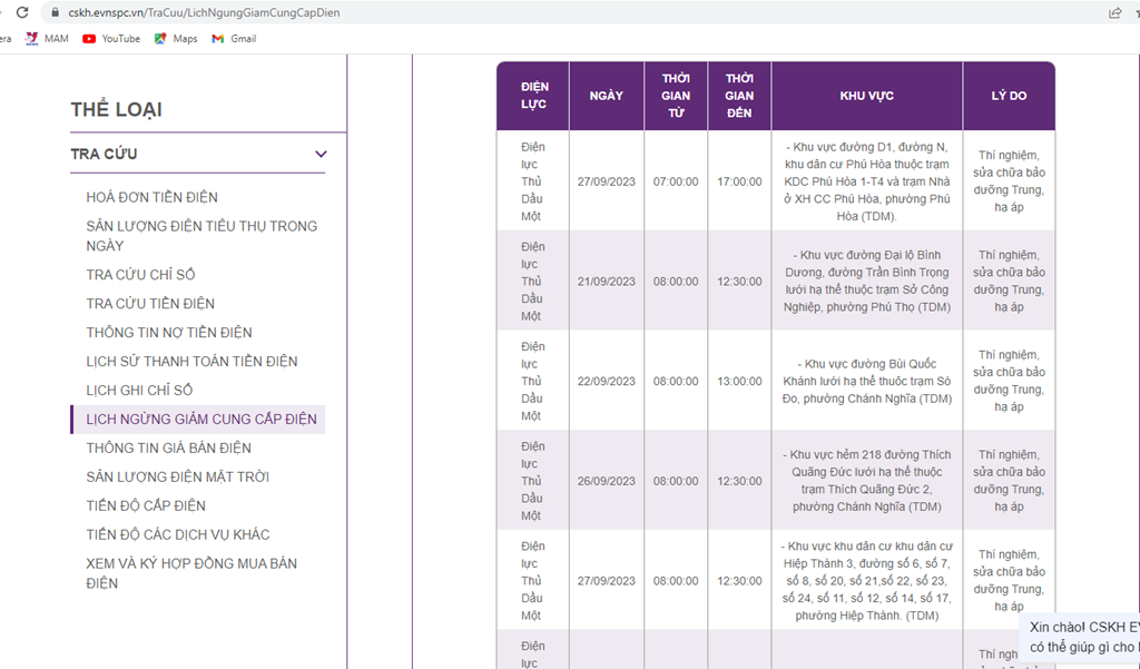 | Điện lực Thủ Dầu Một | 22/09/2023 | 08:00:00 | 13:00:00 | - Khu vực đường Bùi Quốc Khánh lưới hạ thế thuôc trạm Sò Đo, phường Chánh Nghĩa (TDM) | Thí nghiệm, sửa chữa bảo dưỡng Trung, hạ áp |
