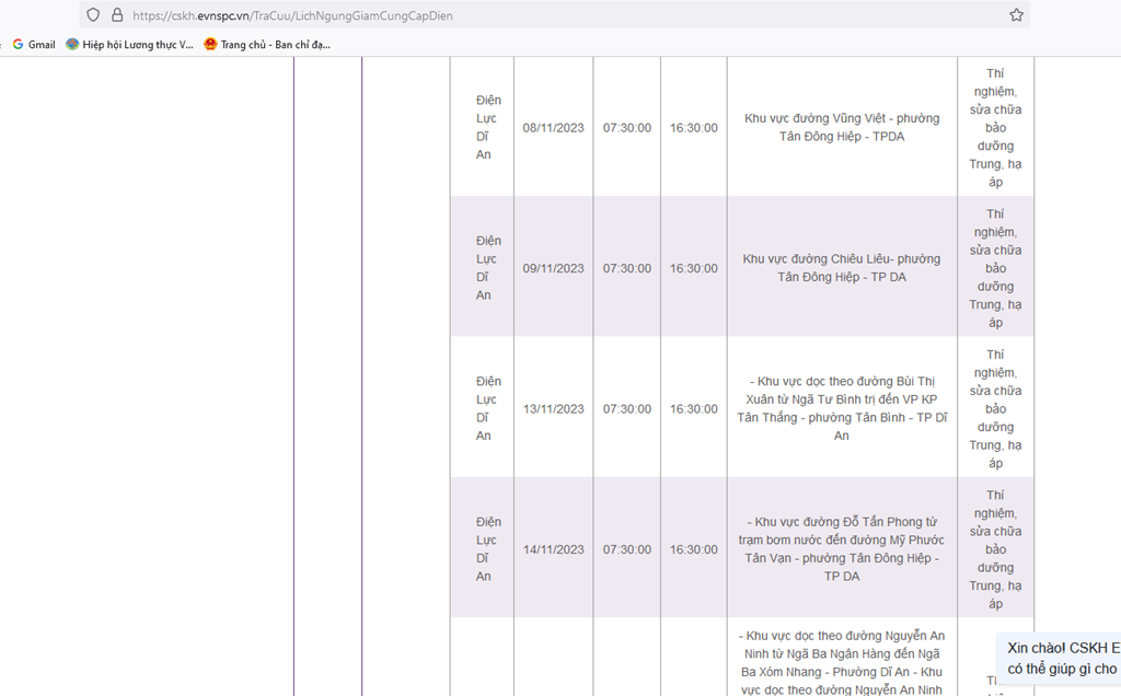 | Điện Lực Dĩ An | 08/11/2023 | 07:30:00 | 16:30:00 | Khu vực đường Vũng Việt - phường Tân Đông Hiệp - TPDA | Thí nghiệm, sửa chữa bảo dưỡng Trung, hạ áp |