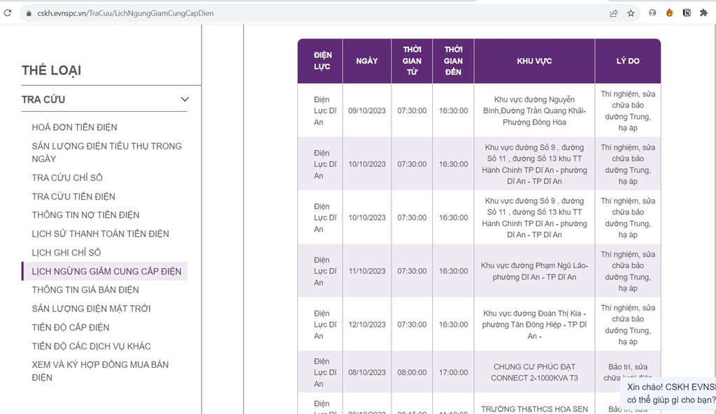 Thông tin cung cấp điện Bình Dương ngày 9/10 cập nhật ngày 8/10 tại www.cskh.evnspc.vn. Ảnh: BNEWS phát