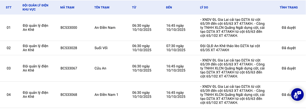 4 | Đội quản lý điện An Khê | BC533068 | An Điền Nam 1 | 06:30 10/10/2025 | 16:45 10/10/2025 | - XNDV ĐL Gia Lai cải tạo DZTA từ cột 65/39 đến cột 65/63 XT 477AKH.- Công ty TNHH XLCN Quãng Ngãi dựng cột, cải tạo DZTA XT 477AKH từ cột 65/63 đến cột 65/102 XT 477AKH. | Đã duyệt |