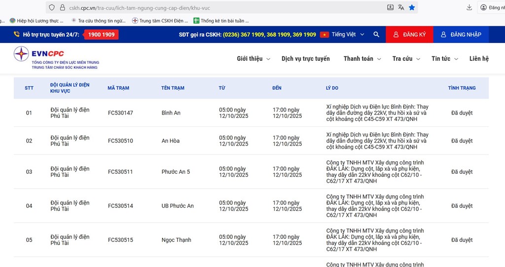 6 | Đội quản lý điện Phú Tài | FC530517 | Phước An 3 | 05:00 12/10/2025 | 17:00 12/10/2025 | Công ty TNHH MTV Xây dựng công trình ĐẮK LẮK: Dựng cột, lắp xà và phụ kiện, thay dây dẫn 22kV khoảng cột C62/10 - C62/17 XT 473/QNH | Đã duyệt |