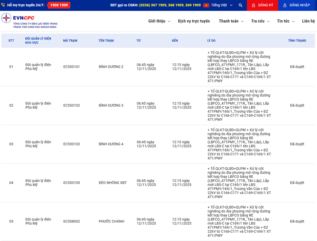 | 5 | Đội quản lý điện Phù Mỹ | EC538002 | PHƯỚC CHÁNH | 06:45 12/11/2025 | 12:15 12/11/2025 | Tổ QLKT-QLBD+QLPMXử lý cột nghiêng do địa phương mở rộng đường kết hợp thay LBFCO bằng RE (LBFCO_471PMY_171R_ Tân Lập), Lắp mới LBS-C tại C169/1 tên LBS 471PMY/169/1_Trương Văn CủaĐZ 22kV từ C166-C171 và C169-C169/1 XT 471/PMY | Đã duyệt |