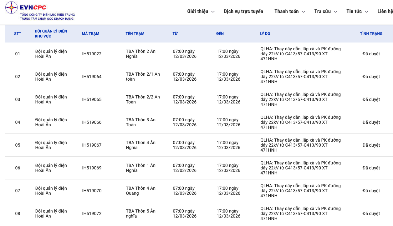 | Đội quản lý điện Hoài Ân | IH519065 | TBA Thôn 2/2 An Toàn | 07:00 12/03/2026 | 17:00 12/03/2026 | QLHA: Thay dây dẫn ,lắp xà và PK đường dây 22kV từ C413/57-C413/90 XT 471HNH | Đã duyệt |