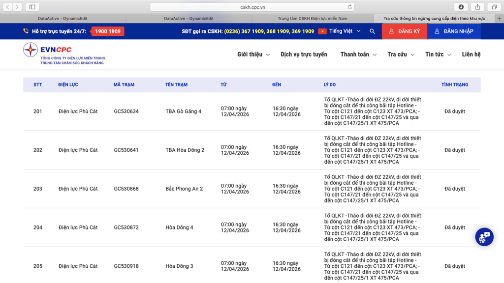 | 10 | Điện lực Phù Cát | GC531020 | Hòa Dõng 5 | 07:00 12/04/2026 | 16:30 12/04/2026 | Tổ QLKT -Tháo di dời ĐZ 22kV, di dời thiết bị đóng cắt để thi công bãi tập Hotline - Từ cột C121 đến cột C123 XT 473/PCA;- Từ cột C147/21 đến cột C147/25 và qua đến cột C147/25/1 XT 475/PCA | Đã duyệt |
