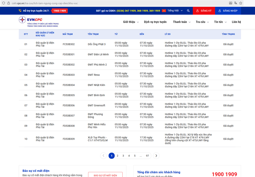 10 | Đội quản lý điện Phú Tài | FD53B309 | XLĐ Tuy Phước - C1/1 XT473/ELM | 05:00 11/10/2025 | 17:30 11/10/2025 | Hotline 1 Cty ĐLGL: Xử lý tiếp xúc lèo pha A đường dây 22kV tại C18 XT 479/LMY (tầng trên chung cột XT 473/LMY tầng dưới) | Đã duyệt |