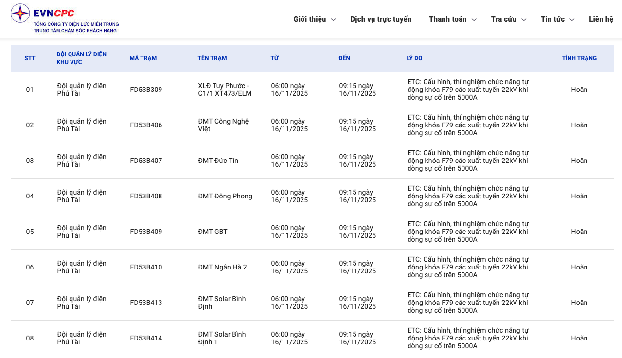 | Đội quản lý điện Phú Tài | FD53B413 | ĐMT Solar Bình Định | 06:00 16/11/2025 | 09:15 16/11/2025 | ETC: Cấu hình, thí nghiệm chức năng tự động khóa F79 các xuất tuyến 22kV khi dòng sự cố trên 5000A | Hoãn |