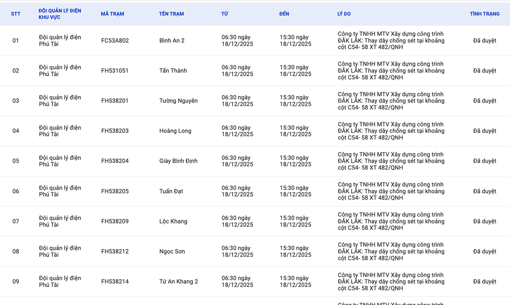 | 9 | Đội quản lý điện Phú Tài | FH538214 | Tứ An Khang 2 | 06:30 18/12/2025 | 15:30 18/12/2025 | Công ty TNHH MTV Xây dựng công trình ĐẮK LẮK: Thay dây chống sét tại khoảng cột C54- 58 XT 482/QNH | Đã duyệt |