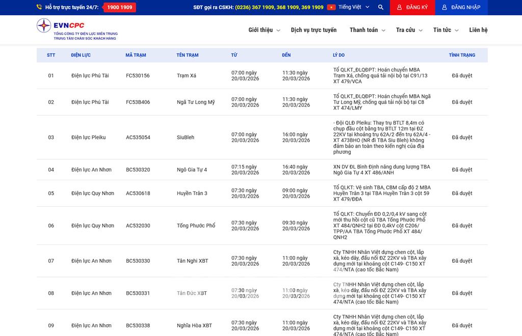 | 1 | Điện lực Phú Tài | FC530156 | Trạm Xá | 07:00 20/03/2026 | 11:30 20/03/2026 | Tổ QLKT_ĐLQĐPT: Hoán chuyển MBA Trạm Xá, chống quá tải nội bộ tại C91/13 XT 479/VCA | Đã duyệt |