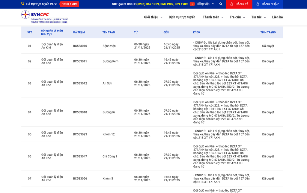 | 1 | Đội quản lý điện An Khê | BC533010 | Bệnh viện | 06:30 21/11/2025 | 16:45 21/11/2025 | - XNDV ĐL Gia Lai dựng chèn cột, thay cột, thay xà, thay dây dẫn DZTA từ cột 157 đến cột 218 XT 471AKH. | Đã duyệt |