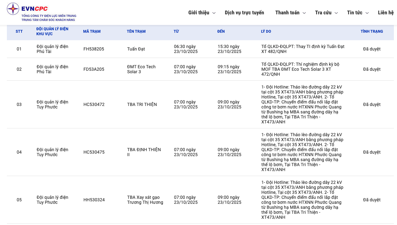 | Đội quản lý điện Phú Tài | FD53A205 | ĐMT Eco Tech Solar 3 | 07:00 23/10/2025 | 09:15 23/10/2025 | Tổ QLKD-ĐQLPT: Thí nghiệm định kỳ bộ MOF TBA ĐMT Eco Tech Solar 3 XT 472/QNH | Đã duyệt |