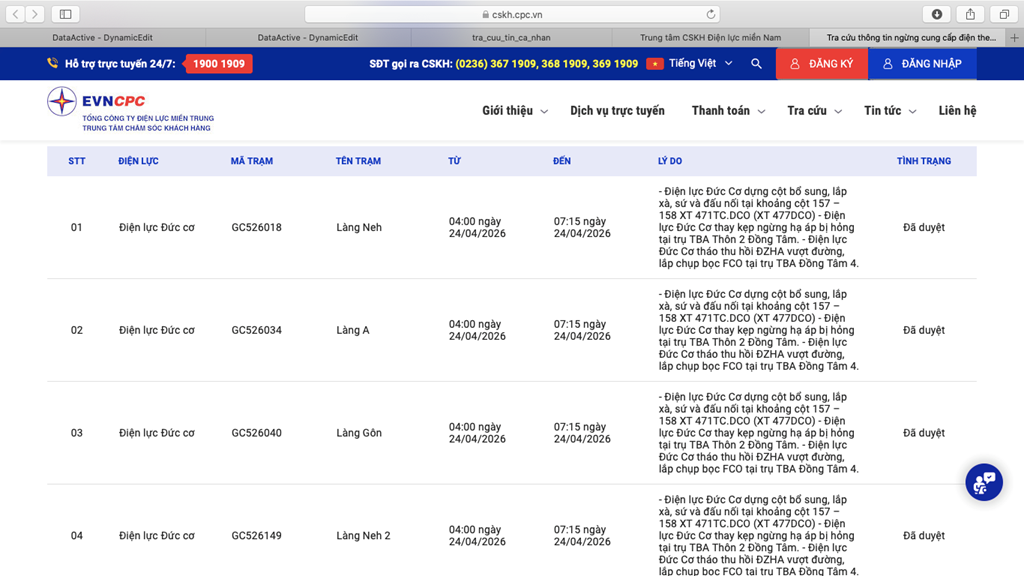 | 7 | Điện lực Đức cơ | GC536015 | Đồng Tâm 1 | 04:00 24/04/2026 | 07:15 24/04/2026 | - Điện lực Đức Cơ dựng cột bổ sung, lắp xà, sứ và đấu nối tại khoảng cột 157 – 158 XT 471TC.DCO (XT 477DCO)- Điện lực Đức Cơ thay kẹp ngừng hạ áp bị hỏng tại trụ TBA Thôn 2 Đồng Tâm.- Điện lực Đức Cơ tháo thu hồi ĐZHA vượt đường, lắp chụp bọc FCO tại trụ TBA Đồng Tâm 4. | Đã duyệt |