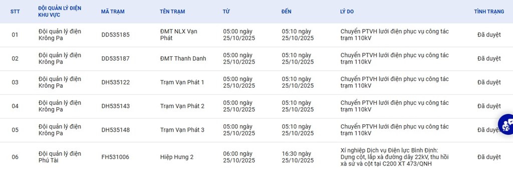 | 5 | Đội quản lý điện Krông Pa | DH535148 | Trạm Vạn Phát 3 | 05:00 25/10/2025 | 05:10 25/10/2025 | Chuyển PTVH lưới điện phục vụ công tác trạm 110kV | Đã duyệt |