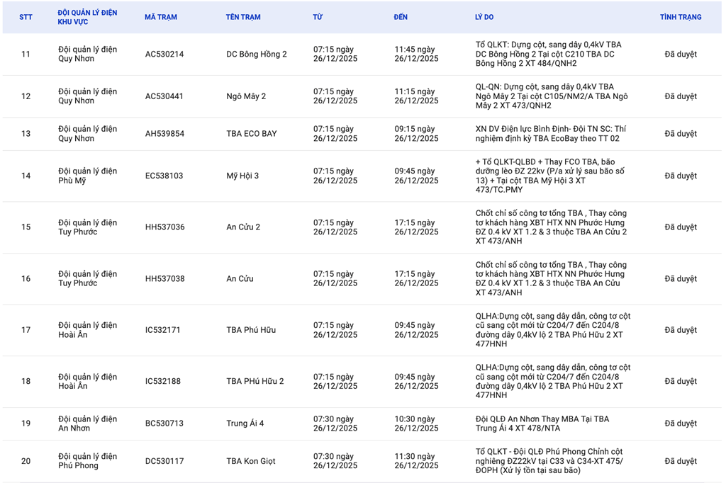| 9 | Đội quản lý điện An Nhơn | BC530713 | Trung Ái 4 | 07:30 26/12/2025 | 10:30 26/12/2025 | Đội QLĐ An Nhơn Thay MBA Tại TBA Trung Ái 4 XT 478/NTA | Đã duyệt |