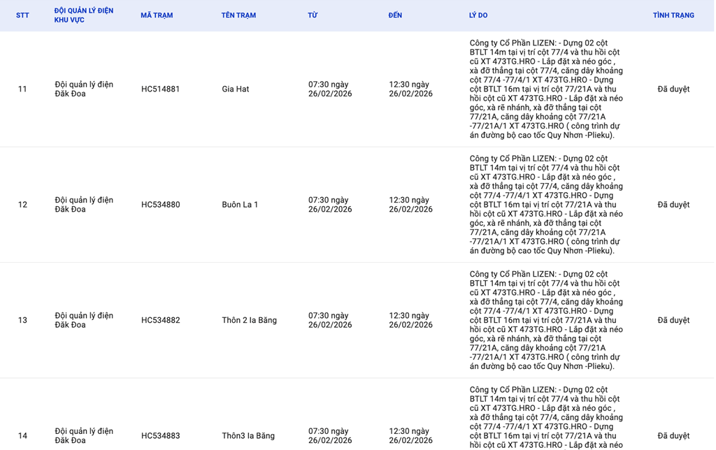 | 7 | Đội quản lý điện Đăk Đoa | HC539209 | Đồi Tranh 2 | 07:30 26/02/2026 | 12:30 26/02/2026 | Công ty Cổ Phần LIZEN:- Dựng 02 cột BTLT 14m tại vị trí cột 77/4 và thu hồi cột cũ XT 473TG.HRO- Lắp đặt xà néo góc , xà đỡ thẳng tại cột 77/4, căng dây khoảng cột 77/4 -77/4/1 XT 473TG.HRO- Dựng cột BTLT 16m tại vị trí cột 77/21A và thu hồi cột cũ XT 473TG.HRO- Lắp đặt xà néo góc, xà rẽ nhánh, xà đỡ thẳng tại cột 77/21A, căng dây khoảng cột 77/21A -77/21A/1 XT 473TG.HRO( công trình dự án đường bộ cao tốc Quy Nhơn -Plieku). | Đã duyệt |