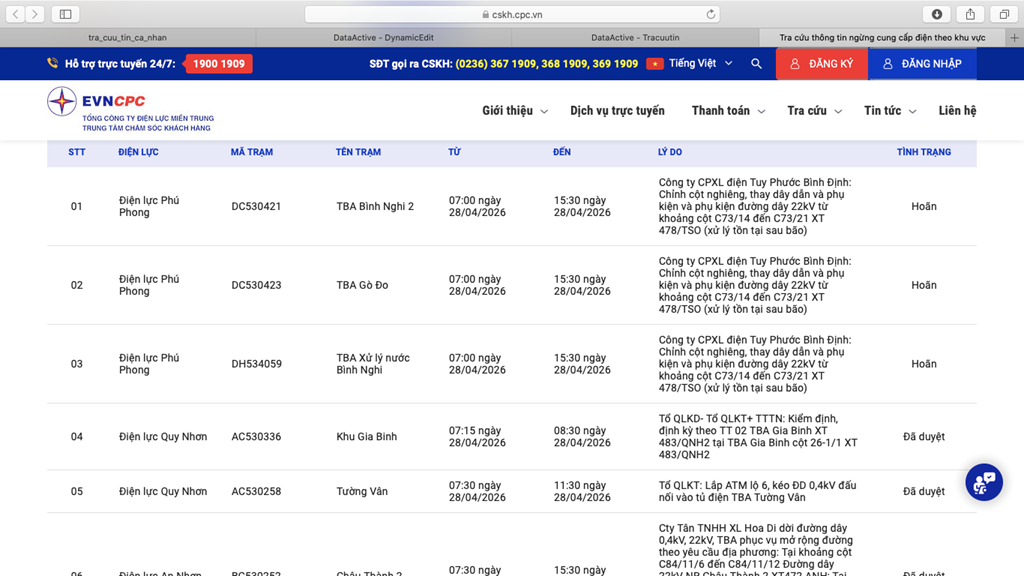 | 5 | Điện lực Quy Nhơn | AC530258 | Tường Vân | 07:30 28/04/2026 | 11:30 28/04/2026 | Tổ QLKT: Lắp ATM lộ 6, kéo ĐD 0,4kV đấu nối vào tủ điện TBA Tường Vân | Đã duyệt |