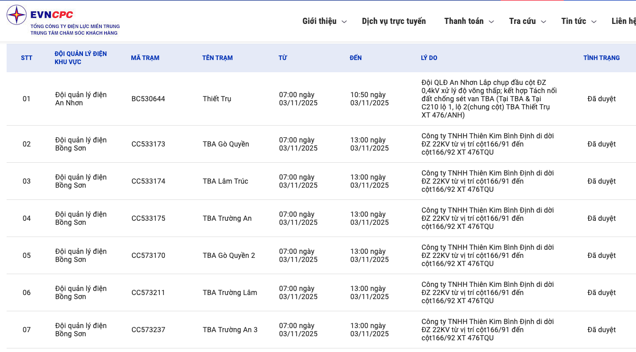 | Đội quản lý điện Bồng Sơn | CC573310 | TBA Gò Quyền 4 | 07:00 03/11/2025 | 13:00 03/11/2025 | Công ty TNHH Thiên Kim Bình Định di dời ĐZ 22KV từ vị trí cột166/91 đến cột166/92 XT 476TQU | Đã duyệt |