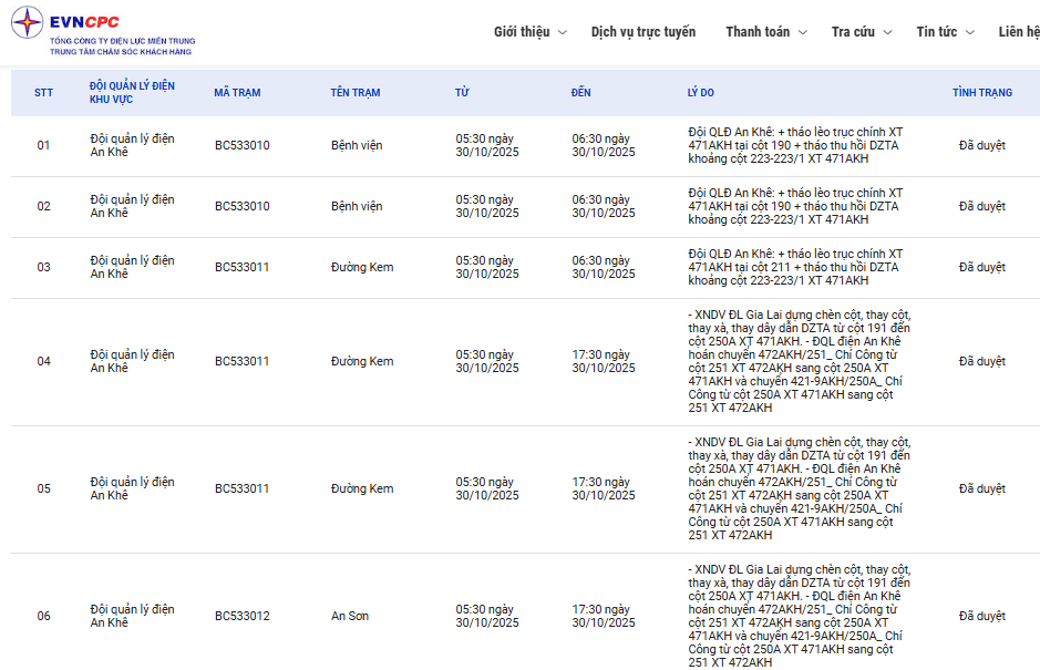 | Đội quản lý điện An Khê | BC533012 | An Sơn | 05:30 30/10/2025 | 17:30 30/10/2025 | - XNDV ĐL Gia Lai dựng chèn cột, thay cột, thay xà, thay dây dẫn DZTA từ cột 191 đến cột 250A XT 471AKH.- ĐQL điện An Khê hoán chuyển 472AKH/251_ Chí Công từ cột 251 XT 472AKH sang cột 250A XT 471AKH và chuyển 421-9AKH/250A_ Chí Công từ cột 250A XT 471AKH sang cột 251 XT 472AKH | Đã duyệt |