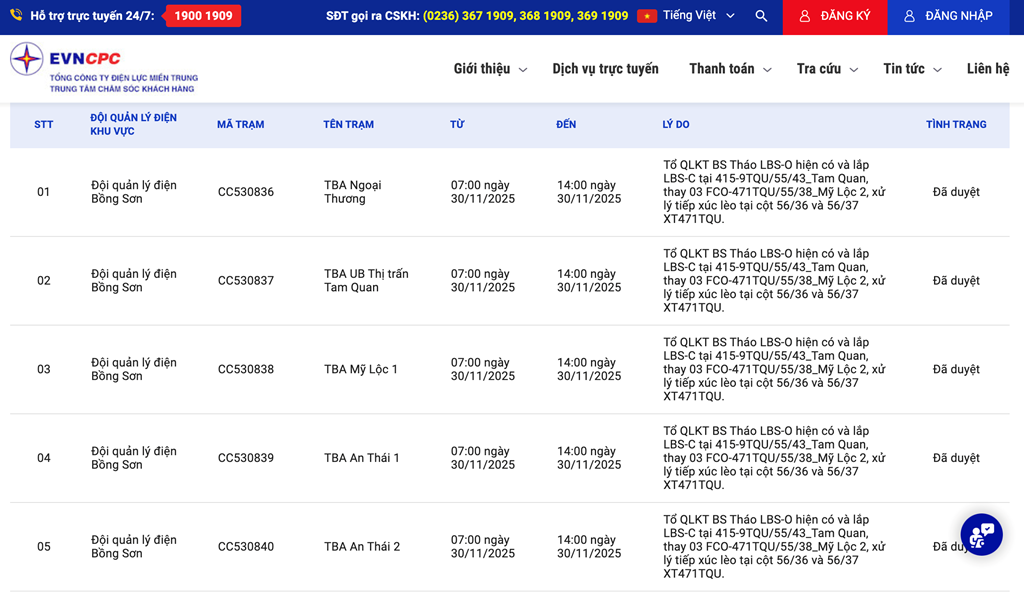 | 1 | Đội quản lý điện Bồng Sơn | CC530836 | TBA Ngoại Thương | 07:00 30/11/2025 | 14:00 30/11/2025 | Tổ QLKT BS Tháo LBS-O hiện có và lắp LBS-C tại 415-9TQU/55/43_Tam Quan, thay 03 FCO-471TQU/55/38_Mỹ Lộc 2, xử lý tiếp xúc lèo tại cột 56/36 và 56/37 XT471TQU. | Đã duyệt |
