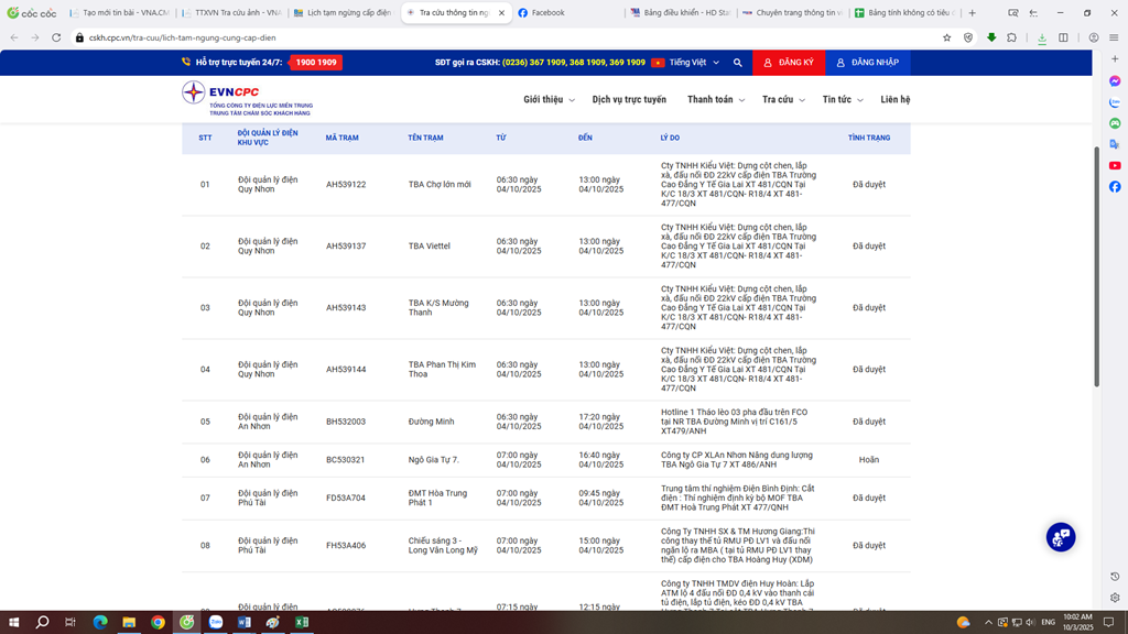 10 | Đội quản lý điện Quy Nhơn | AH539200 | TBA Nước Đá Vấn Trinh | 07:15 04/10/2025 | 11:45 04/10/2025 | Công Ty TNHH XD TH Nhân Tín: Xử lý rịn dầu nấc phân áp, thay ron sứ hạ thế MBA Vấn TrinhTại cột 47/15-1/6/1-1/1 XT 477/ĐĐA | Đã duyệt |