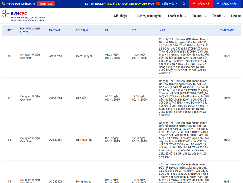| 4 | Đội quản lý điện Quy Nhơn | AC530326 | Hùng Vương | 06:00 05/11/2025 | 17:00 05/11/2025 | Công ty TNHH tư vấn XDĐ Khánh Minh:- Đấu nối ĐD cáp ngầm 22kV tại cột C55, C60 và cột 54/8 XT 475ĐĐA- Lắp đặt 02 LBS-C tại cột C55 (LBS 475ĐĐA/55_Ông Thọ) và cột 54/1 (LBS 475ĐĐA/54/1_Tú Mỡ) XT 475ĐĐA- Kéo dây, lắp xà, thu hồi dây, thu hồi cột ĐD 22kV từ cột C55 đến cột C59 XT 475ĐĐA- Kéo ĐD 0,4kV đấu nối vào tủ điện TBA Gỗ 2-9 XT 475ĐĐA- Sang công tơ qua ĐD kéo mới Tại ĐD 22kV từ cột 53 đến cột 62, cột 54/4 XT 475/ĐĐA | Hoãn |