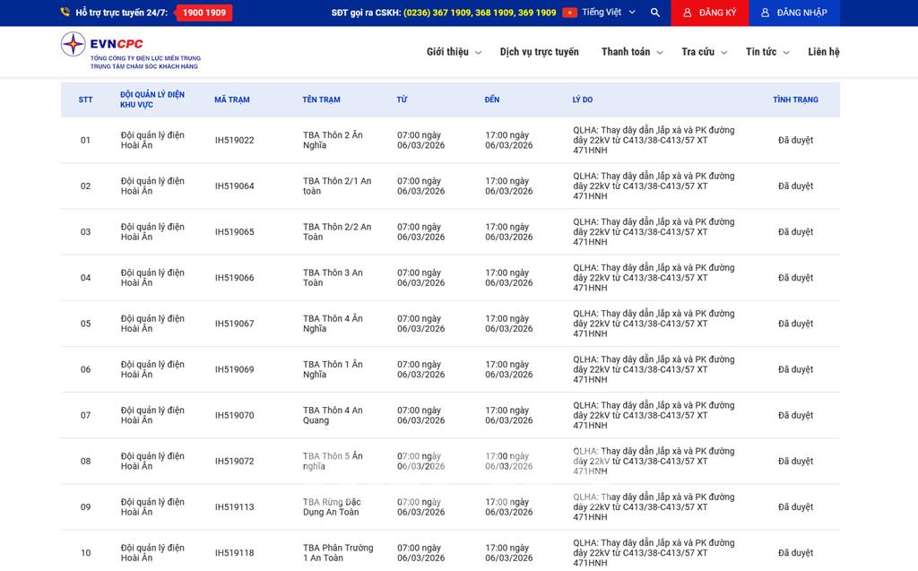 | 10 | Đội quản lý điện Hoài Ân | IH519118 | TBA Phân Trường 1 An Toàn | 07:00 06/03/2026 | 17:00 06/03/2026 | QLHA: Thay dây dẫn ,lắp xà và PK đường dây 22kV từ C413/38-C413/57 XT 471HNH | Đã duyệt |