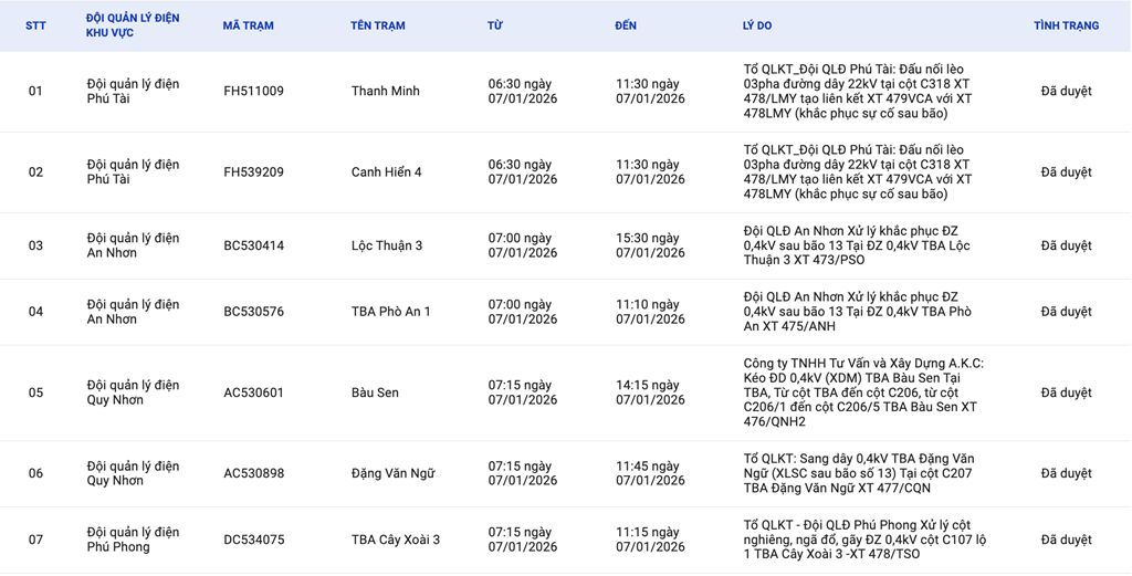 | 4 | Đội quản lý điện An Nhơn | BC530576 | TBA Phò An 1 | 07:00 07/01/2026 | 11:10 07/01/2026 | Đội QLĐ An Nhơn Xử lý khắc phục ĐZ 0,4kV sau bão 13 Tại ĐZ 0,4kV TBA Phò An XT 475/ANH | Đã duyệt |