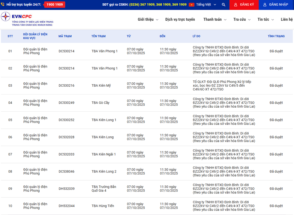 2 | Đội quản lý điện Phú Phong | DC530214 | TBA Văn Phong 1 | 07:00 07/10/2025 | 11:30 07/10/2025 | Công ty TNHH ĐTXD Định Bình:Di dời ĐZ22kV từ C49/2 đến C49/4-XT 472/TSO (theo yêu cầu của sở văn hóa tỉnh Gia Lai) | Đã duyệt |