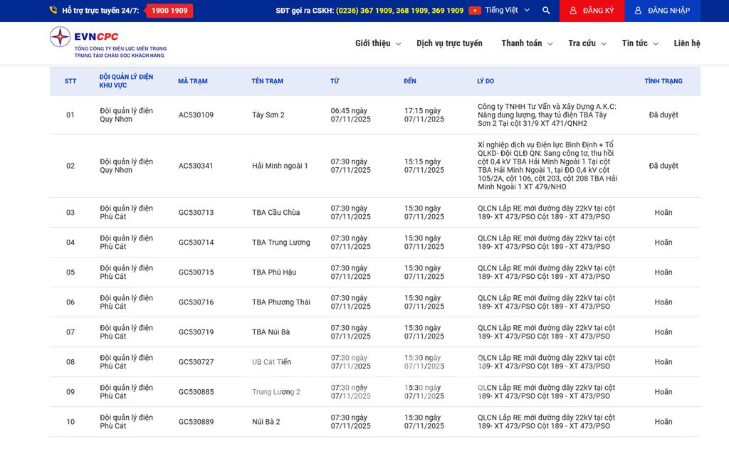 | 6 | Đội quản lý điện Phù Cát | GC530716 | TBA Phương Thái | 07:30 07/11/2025 | 15:30 07/11/2025 | QLCN Lắp RE mới đường dây 22kV tại cột 189- XT 473/PSO Cột 189 - XT 473/PSO | Hoãn |