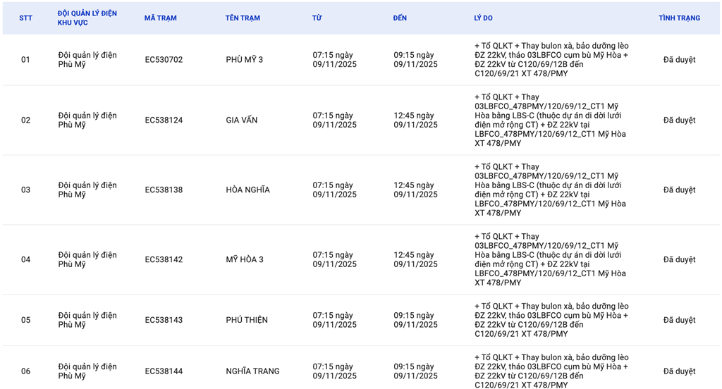 | 4 | Đội quản lý điện Phù Mỹ | EC538142 | MỸ HÒA 3 | 07:15 09/11/2025 | 12:45 09/11/2025 | + Tổ QLKT+ Thay 03LBFCO_478PMY/120/69/12_CT1 Mỹ Hòa bằng LBS-C (thuộc dự án di dời lưới điện mở rộng CT)+ ĐZ 22kV tại LBFCO_478PMY/120/69/12_CT1 Mỹ Hòa XT 478/PMY | Đã duyệt |