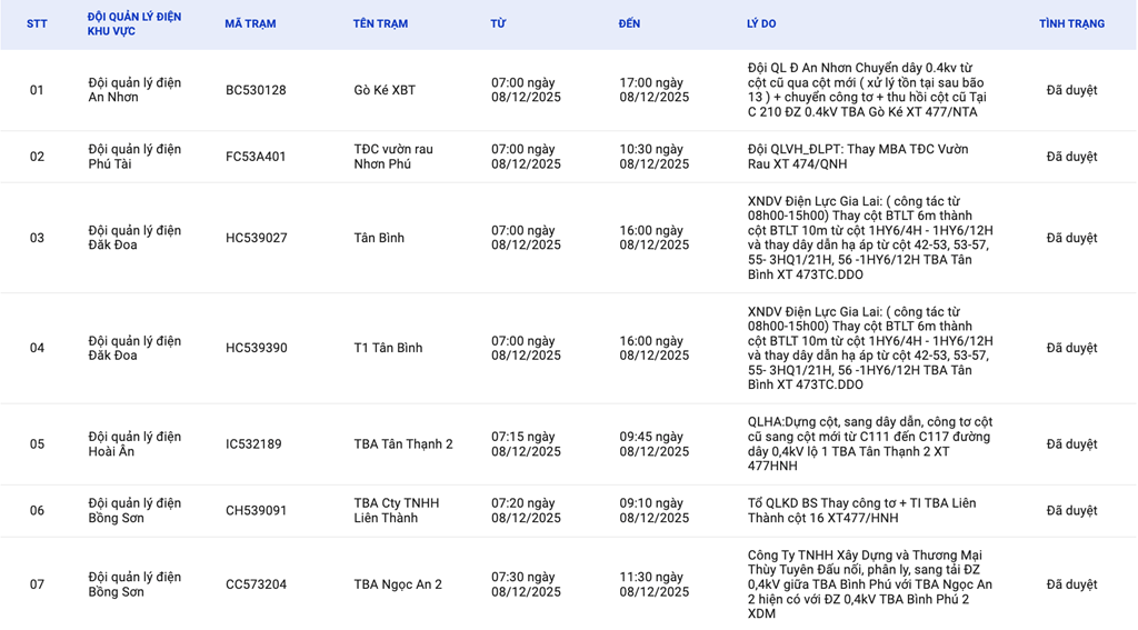 | 8 | Đội quản lý điện Bồng Sơn | CC573205 | TBA Bình Phú | 07:30 08/12/2025 | 11:30 08/12/2025 | Công Ty TNHH Xây Dựng và Thương Mại Thùy Tuyên Đấu nối, phân ly, sang tải ĐZ 0,4kV giữa TBA Bình Phú với TBA Ngọc An 2 hiện có với ĐZ 0,4kV TBA Bình Phú 2 XDM | Đã duyệt |