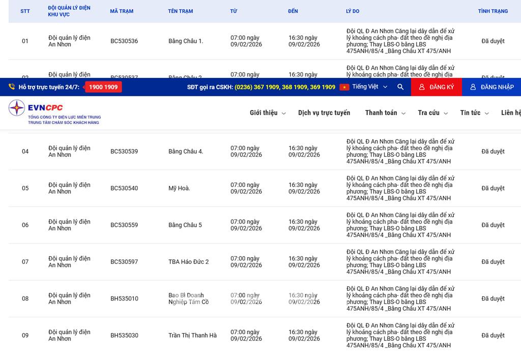 | 1 | Đội quản lý điện An Nhơn | BC530536 | Bằng Châu 1. | 07:00 09/02/2026 | 16:30 09/02/2026 | Đội QL Đ An Nhơn Căng lại dây dẫn để xử lý khoảng cách pha- đất theo đề nghị địa phương; Thay LBS-O bằng LBS 475ANH/85/4 _Bằng Châu XT 475/ANH | Đã duyệt |