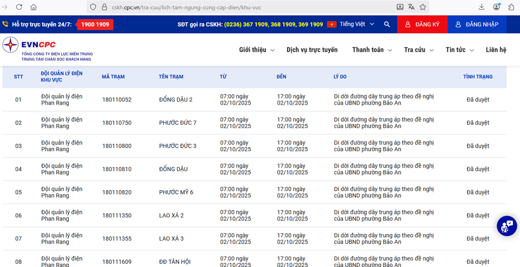 Đội quản lý điện Phan Rang | 180132450 | TẤN TÀI | 07:00 02/10/2025 | 12:00 02/10/2025 | Sửa chữa bảo dưỡng lưới điện | Hoãn |