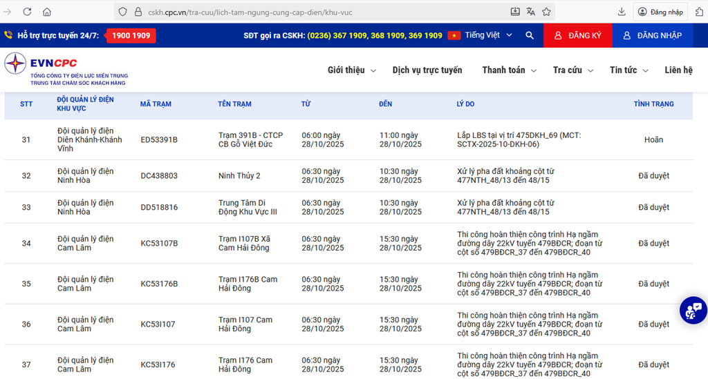 | Đội quản lý điện Cam Lâm | KD53I637 | Khu Nghĩ Mát MIARESOR | 06:50 28/10/2025 | 07:00 28/10/2025 | Cắt DCL vị trí 472BĐCR_66 | Đã duyệt |