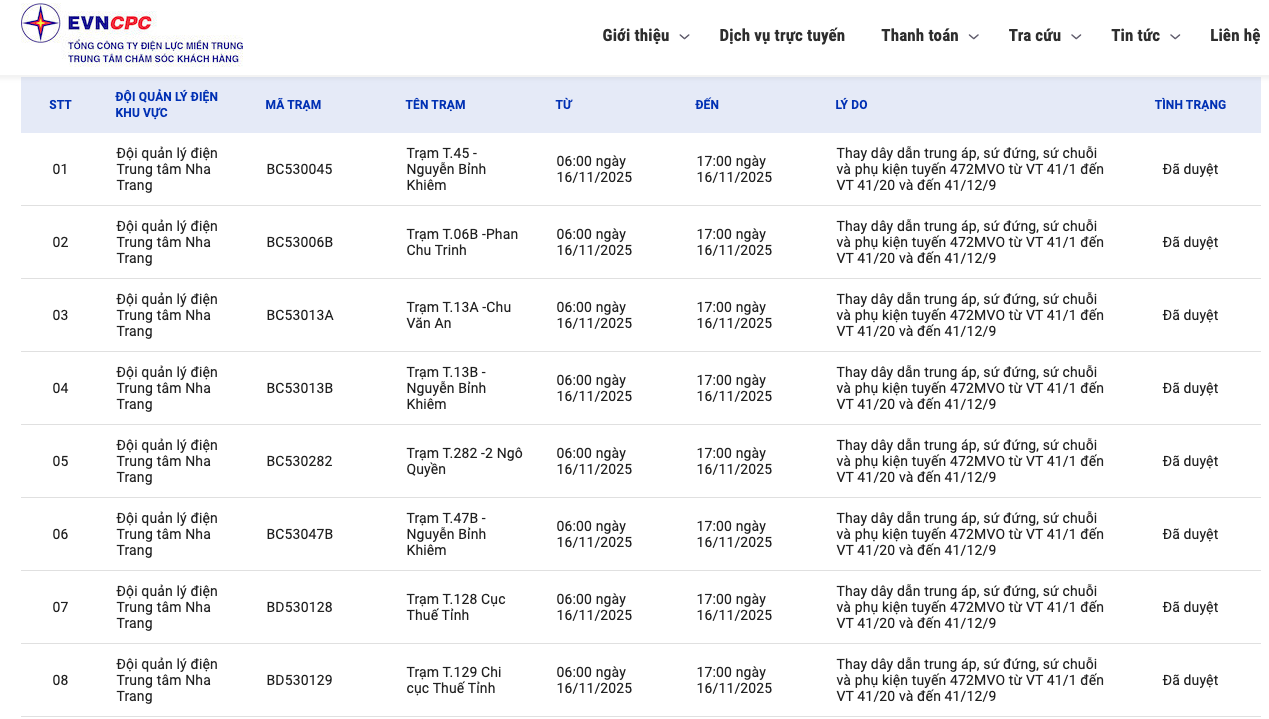 | Đội quản lý điện Trung tâm Nha Trang | BC53006B | Trạm T.06B -Phan Chu Trinh | 06:00 16/11/2025 | 17:00 16/11/2025 | Thay dây dẫn trung áp, sứ đứng, sứ chuỗi và phụ kiện tuyến 472MVO từ VT 41/1 đến VT 41/20 và đến 41/12/9 | Đã duyệt |