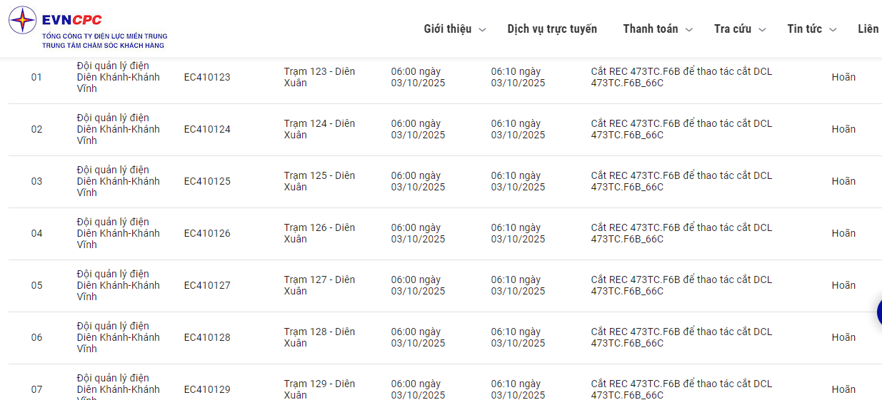 Đội quản lý điện Diên Khánh-Khánh Vĩnh | EC410124 | Trạm 124 - Diên Xuân | 06:00 03/10/2025 | 06:10 03/10/2025 | Cắt REC 473TC.F6B để thao tác cắt DCL 473TC.F6B_66C | Hoãn |
