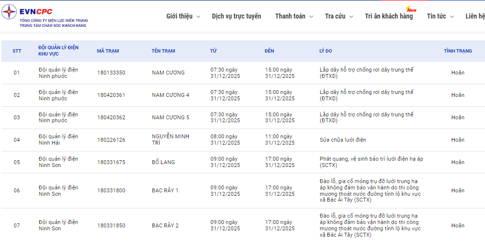 | Đội quản lý điện Ninh Hải | 180226126 | NGUYỄN MINH TRÍ | 08:00 31/12/2025 | 11:00 31/12/2025 | Sửa chữa lưới điện | Hoãn |