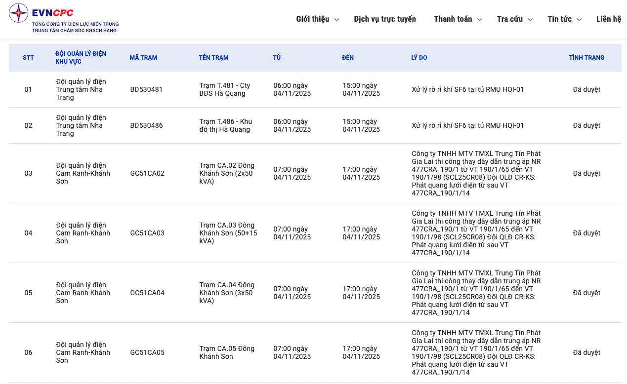 | Đội quản lý điện Cam Ranh-Khánh Sơn | GC51CA08 | Trạm CA.08 Đông Khánh Sơn (2x25 kVA) | 07:00 04/11/2025 | 17:00 04/11/2025 | Công ty TNHH MTV TMXL Trung Tín Phát Gia Lai thi công thay dây dẫn trung áp NR 477CRA_190/1 từ VT 190/1/65 đến VT 190/1/98 (SCL25CR08)Đội QLĐ CR-KS: Phát quang lưới điện từ sau VT 477CRA_190/1/14 | Đã duyệt |