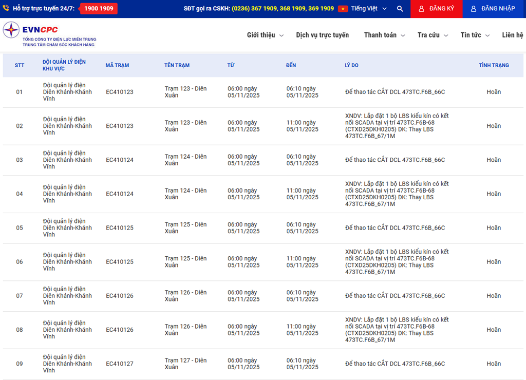 | 9 | Đội quản lý điện Diên Khánh-Khánh Vĩnh | EC410127 | Trạm 127 - Diên Xuân | 06:00 05/11/2025 | 06:10 05/11/2025 | Để thao tác CẮT DCL 473TC.F6B_66C | Hoãn |