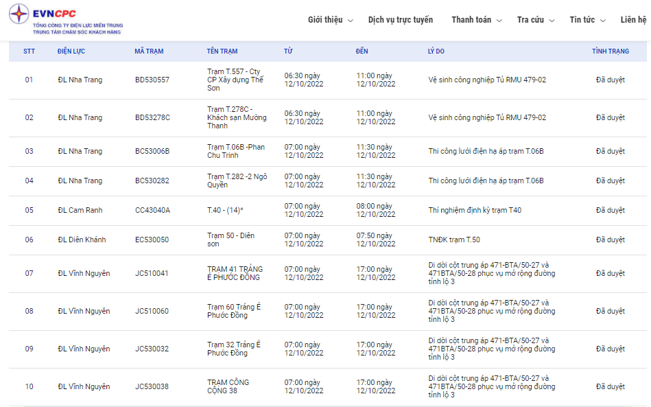 Lịch cắt điện Khánh Hòa ngày mai 12/10 trên website của EVNCPC. Ảnh: BNEWS